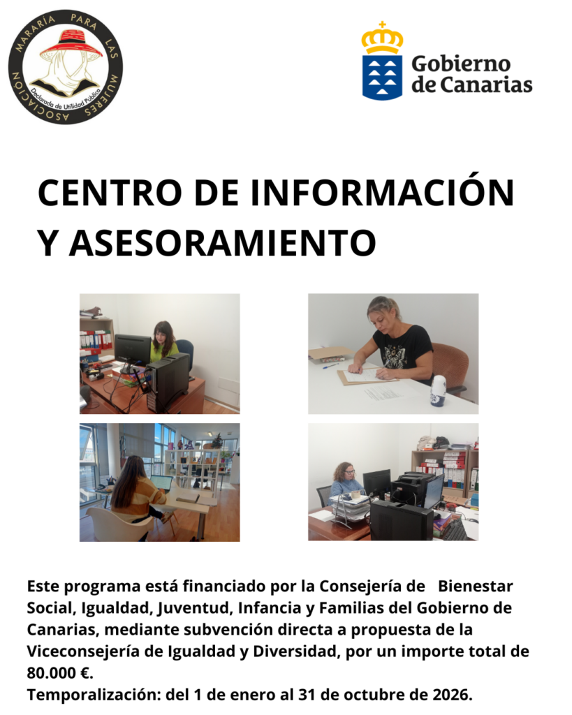 La Asociación Mararía está desarrollando el proyecto “Centro de Información y Asesoramiento”, cuyo objetivo principal es ofrecer un servicio de atención integral a mujeres en situación de vulnerabilidad, con el fin de prevenir o reducir el riesgo de exclusión social.